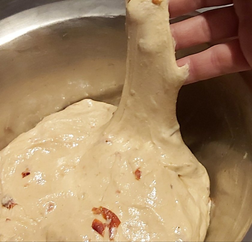 Der Teig ruht nun 2,5 Stunden bei Raumtemperatur und wird währenddessen 3x schonend gedehnt und gefaltet.