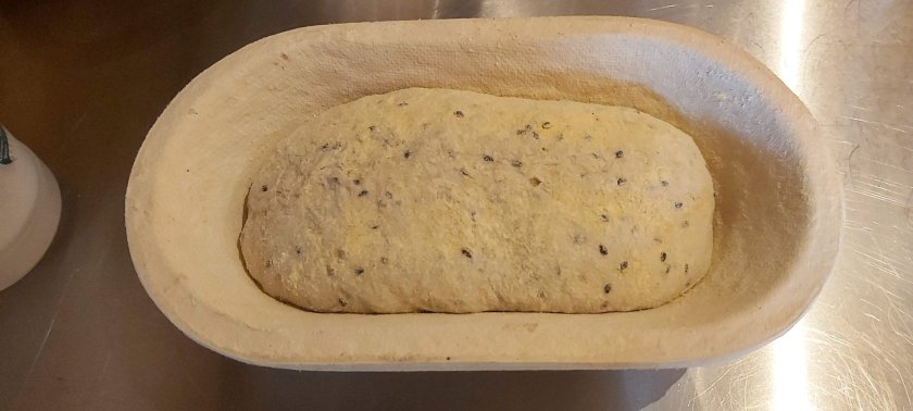 Der Laib ruht nochmals 1 Stunde bei Raumtemperatur, bevor er weitere 12 bis 24 Stunden im Kühlschrank reift.