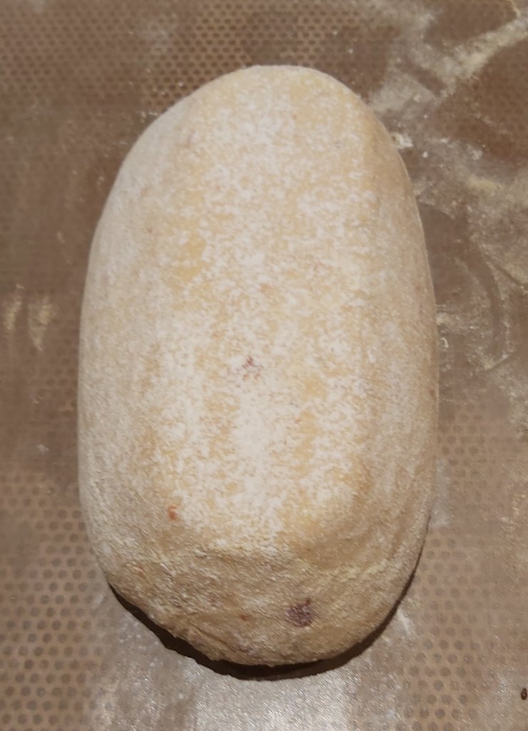Anschließend zu einem länglichen Laib formen, mit Maismehl bemehlen und in ein passendes Gärkörbchen geben.