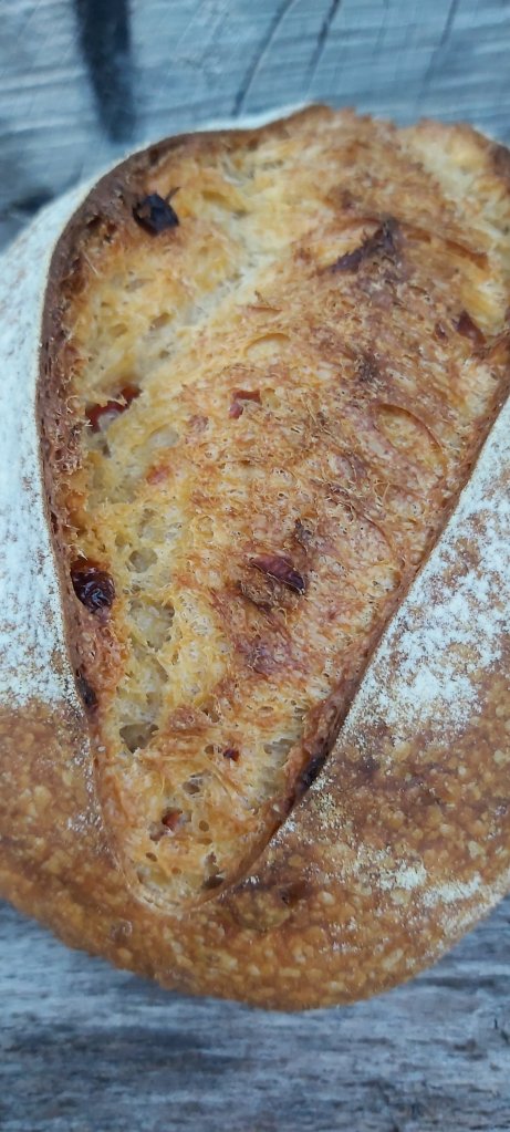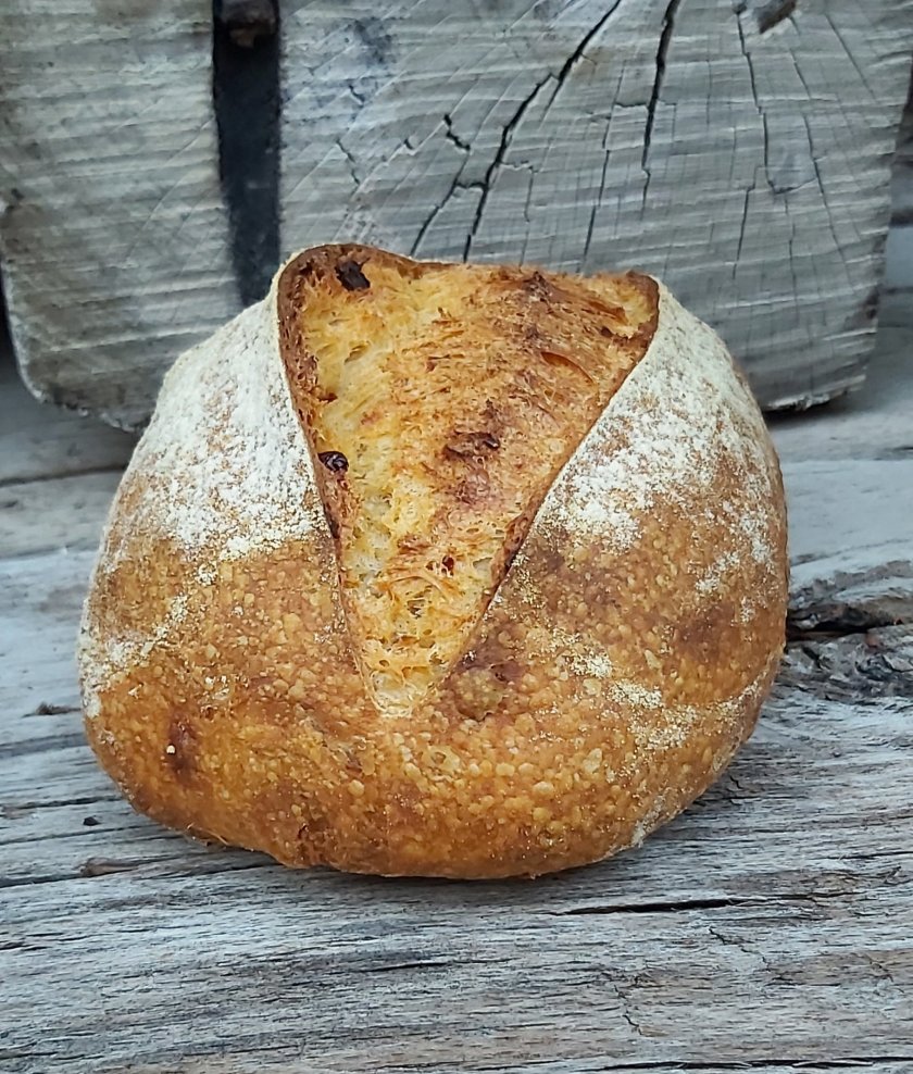 Am Backtag den Ofen auf 250 Grad aufheizen, den Laib direkt aus dem Kühlschrank mittig einschneiden und mit Schwaden 10 Minuten anbacken.