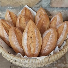 Den Backofen rechtzeitig auf 250 Grad aufheizen, die Teiglinge mittig einschneiden und mit Schwaden 8 Minuten anbacken. Nach dieser Zeit die Temperatur auf 200 Grad reduzieren und weitere 15 Minuten fertig backen.
