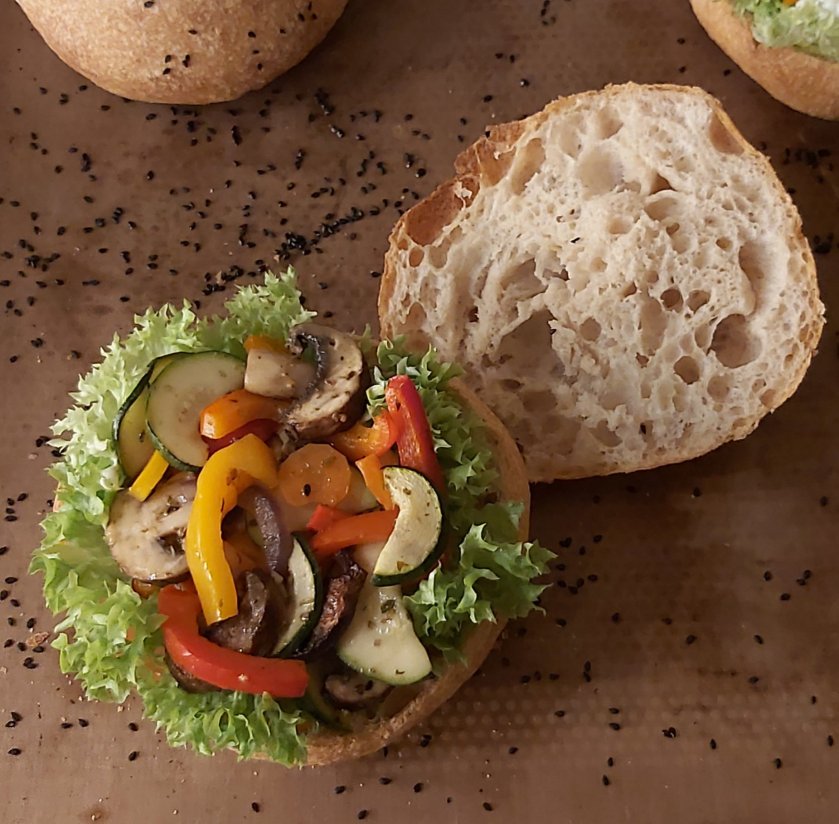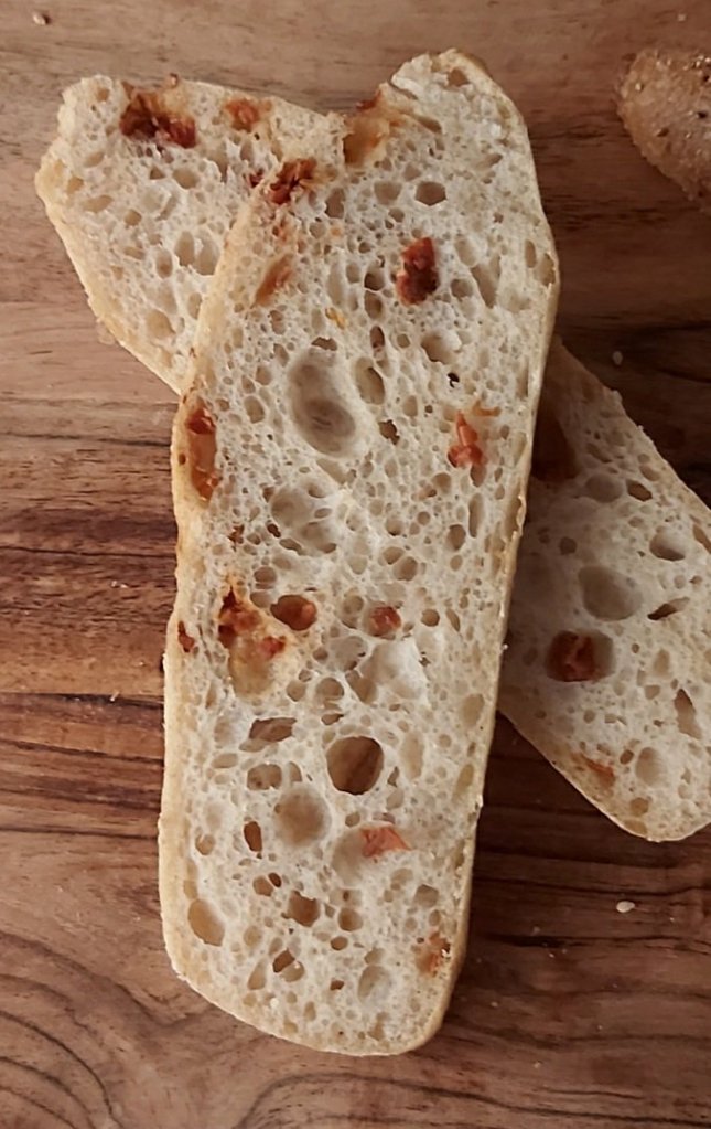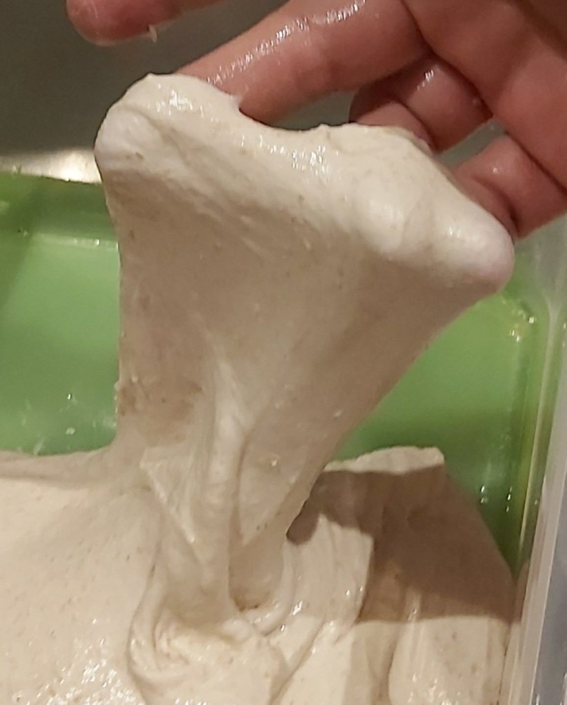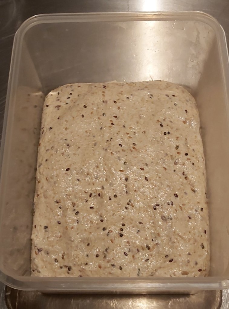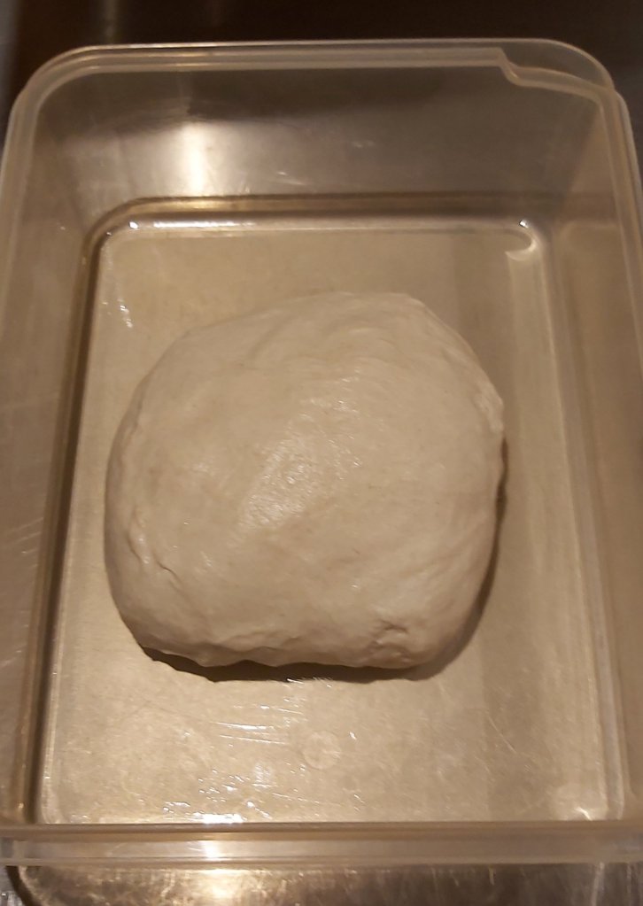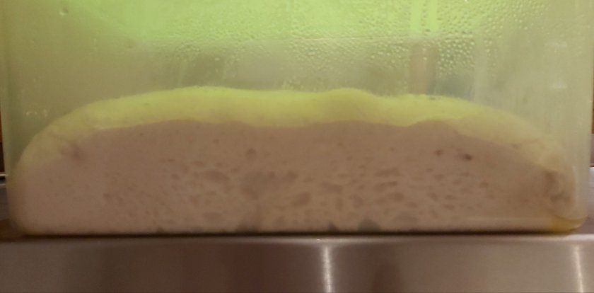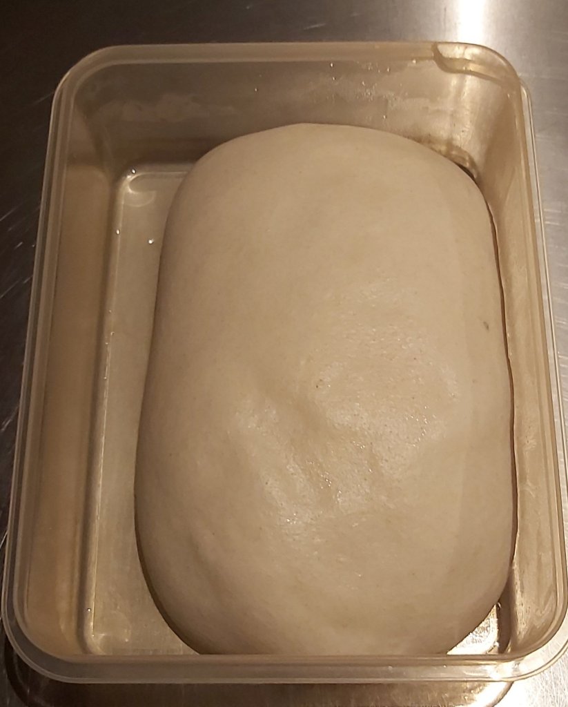Zutaten zu einem homogenen Teig kneten und in eine geölte Wanne geben. 2 Stunden an einem warmen Ort reifen lassen und während dieser Zeit 2x dehnen und falten.