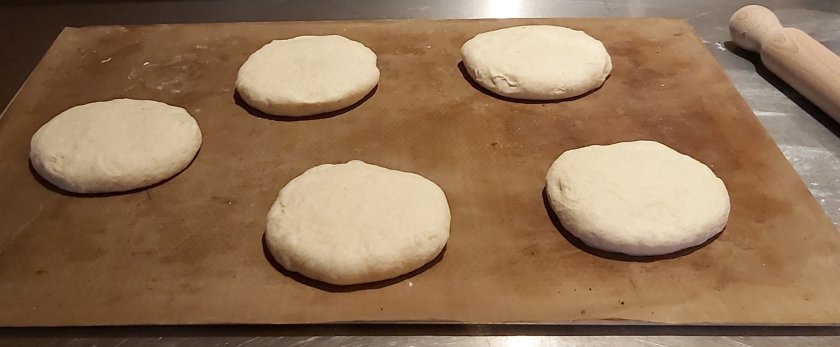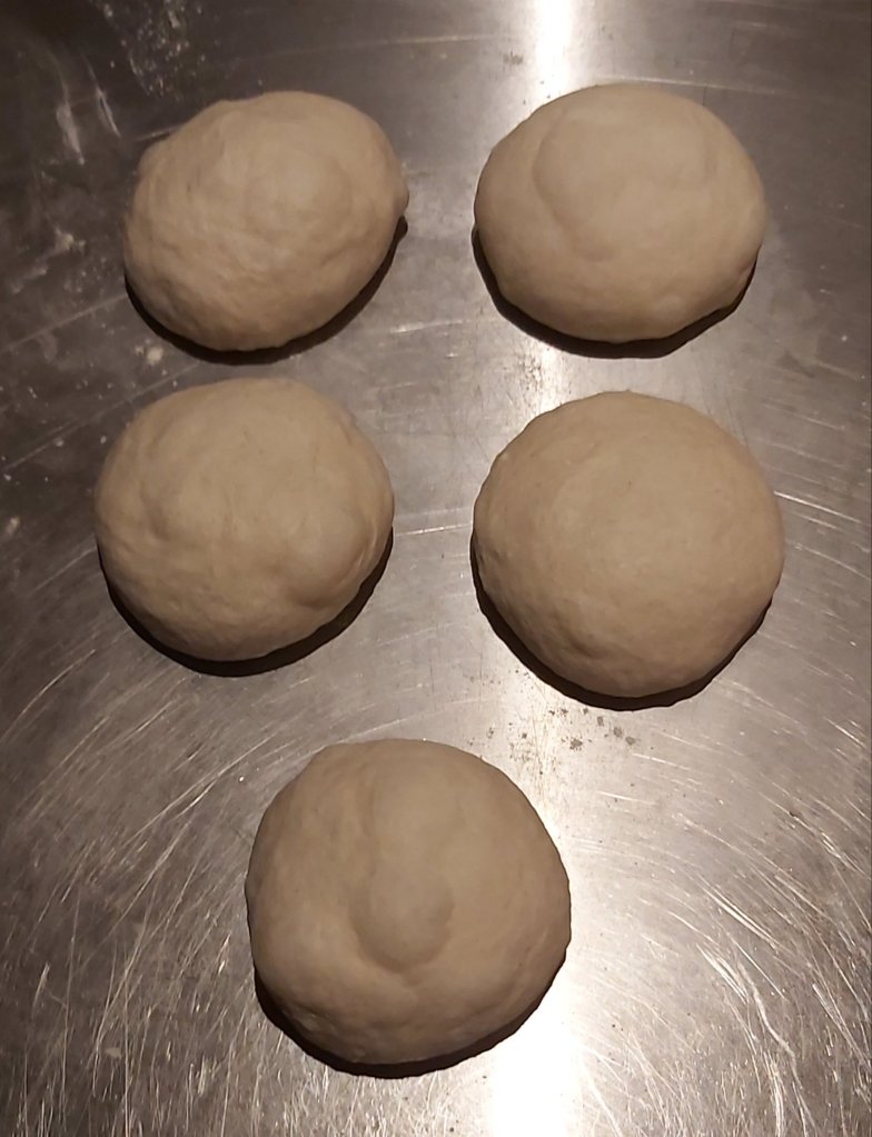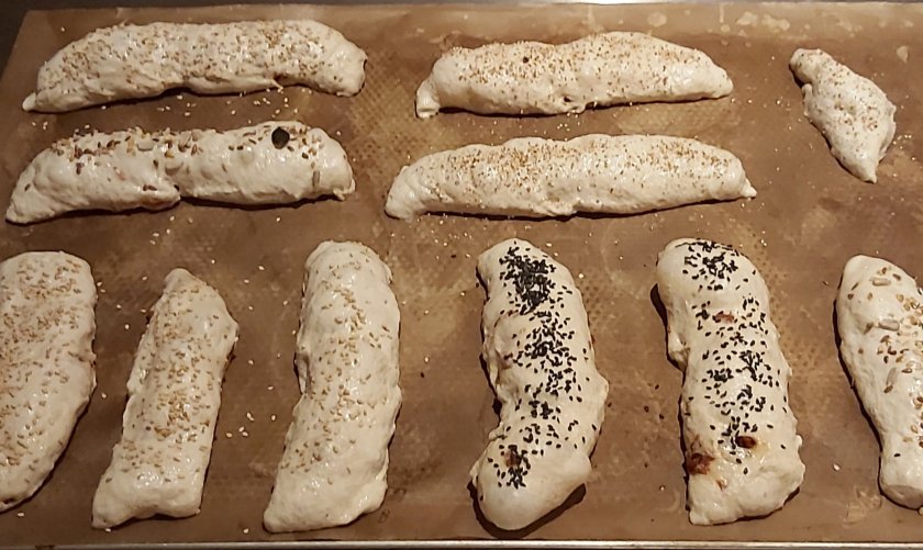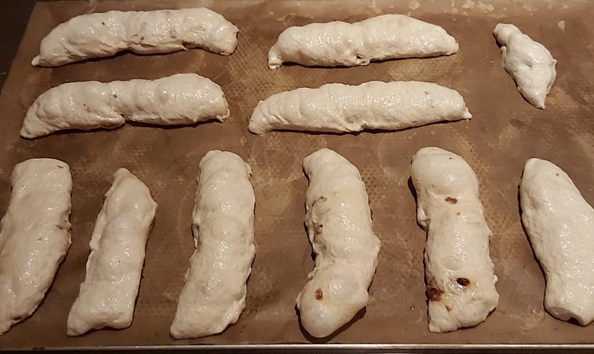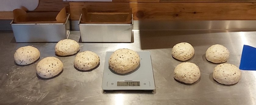 Anschließend 8 gleich große Teiglinge a 250 g abstechen und rund wirken. Und, wie im Video zu sehen, zu länglichen Teiglingen formen.