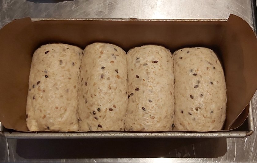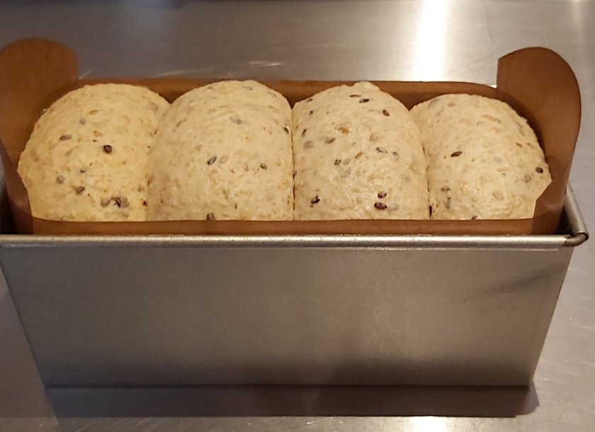 Je 4 Teiglinge in eine Kastenform setzen, abdecken und so lange an einem warmen Ort reifen lassen, bis sie den Rand der Kastenform