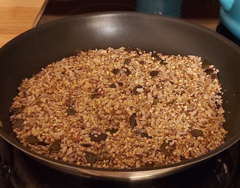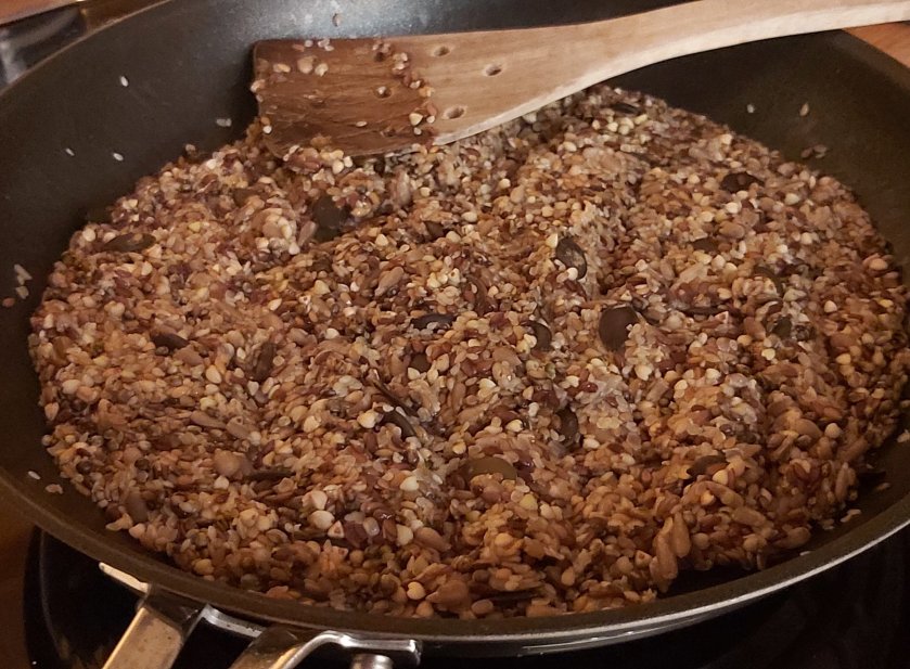 Die Saaten in einer Pfanne anrösten, mit dem Wasser direkt in der Pfanne ablöschen und abkühlen lassen. So fangt ihr die feinen Röstaromen ein, die eurem Toast einen tollen Geschmack verleihen. Das Quellstück könnt ihr schon einen Tag zuvor zubereiten und im Kühlschrank lagern.