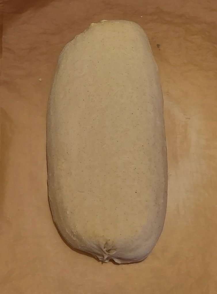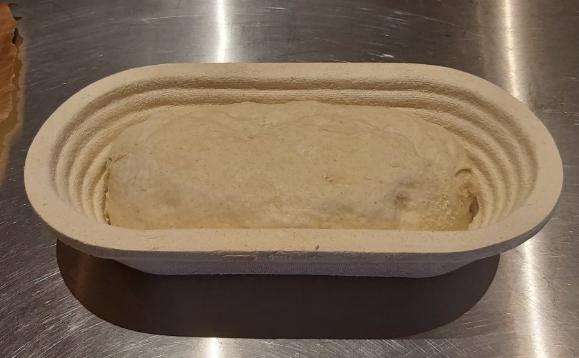 Anschließend wird der Teig zu einem länglichen Laib geformt, mit Maismehl bemehlt und in ein passendes Gärkörbchen zur Stückgare gegeben.