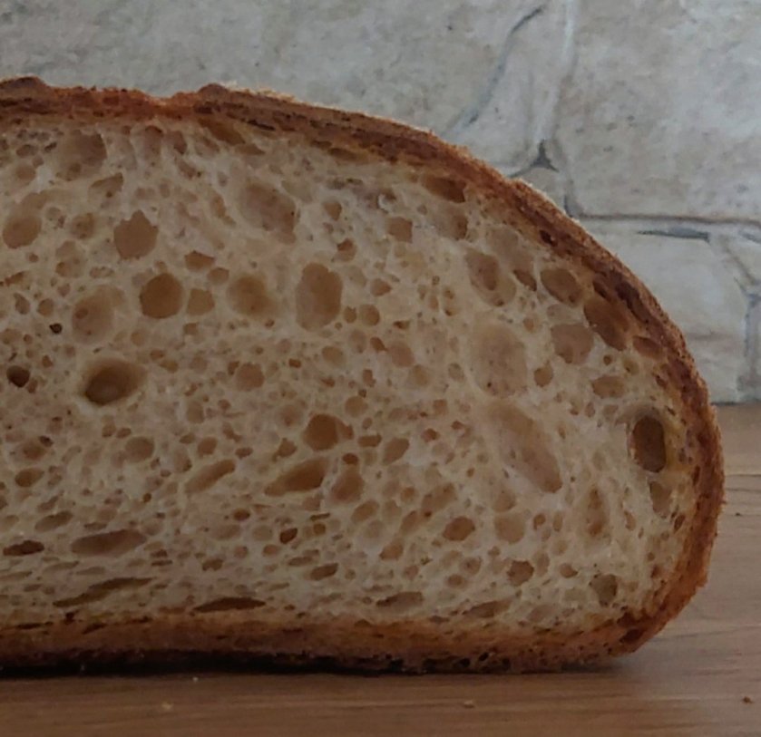 Meinen Laib habe ich bei Vollgare (die Delle beim Fingertest springt nur sehr langsam zurück) mit der Rasierklinge etwas verziert und mit Schwaden für 10 Minuten angebacken. Natürlich könnt ihr euer Brot ganz normal einschneiden.