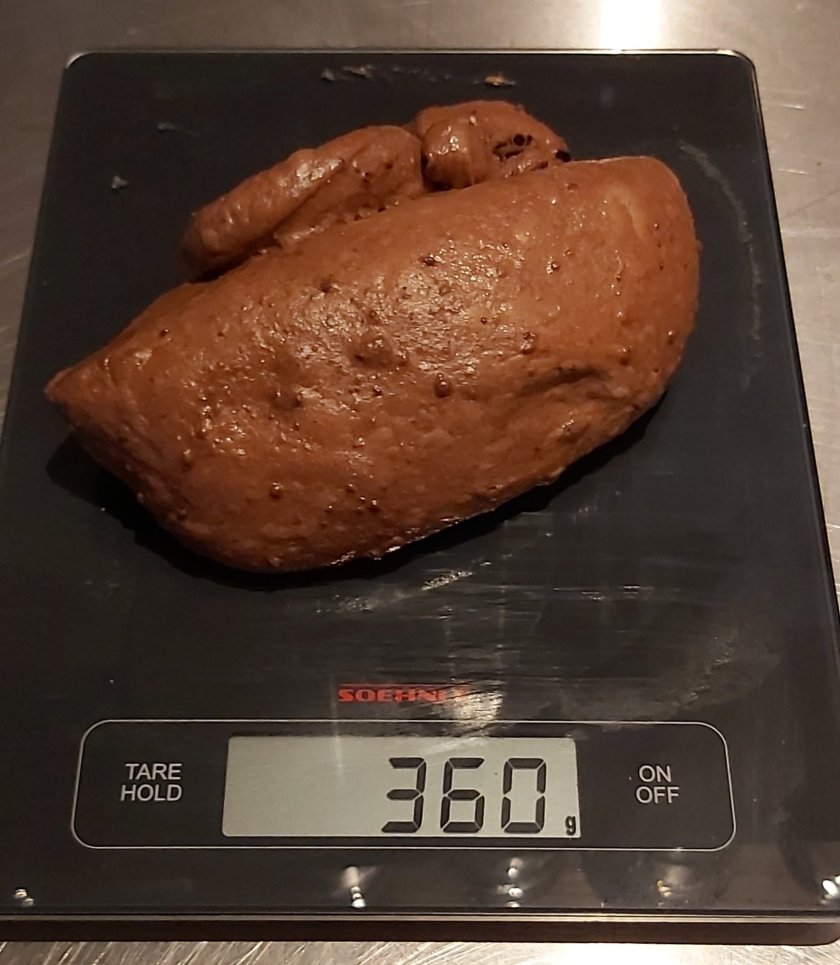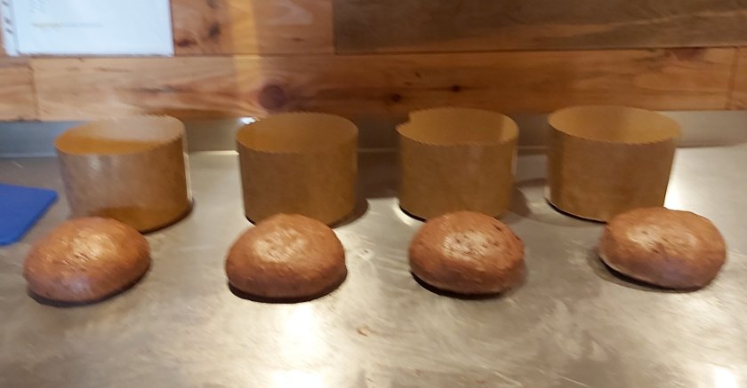 Dafür wird der Teig in 4 Teiglinge a 360 g geteilt, rund gewirkt und in passende Panettoneformen gegeben.